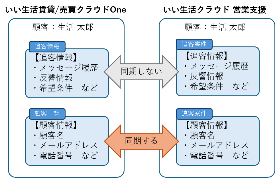 2.『いい生活賃貸/売買クラウドOne』と『いい生活クラウド 営業支援』の追客情報は同期しません