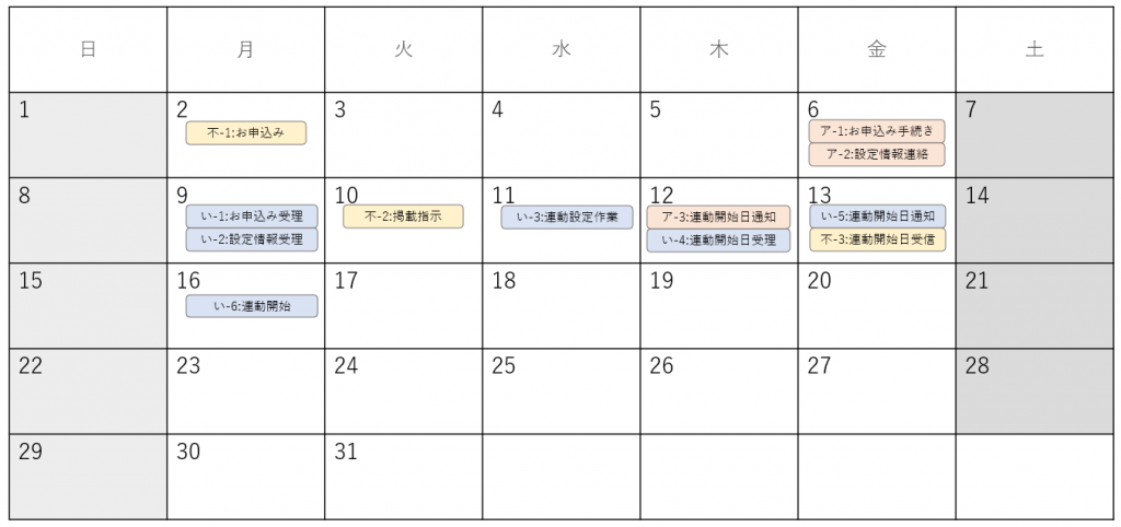 連動開始までのスケジュール例をカレンダー形式でまとめております。